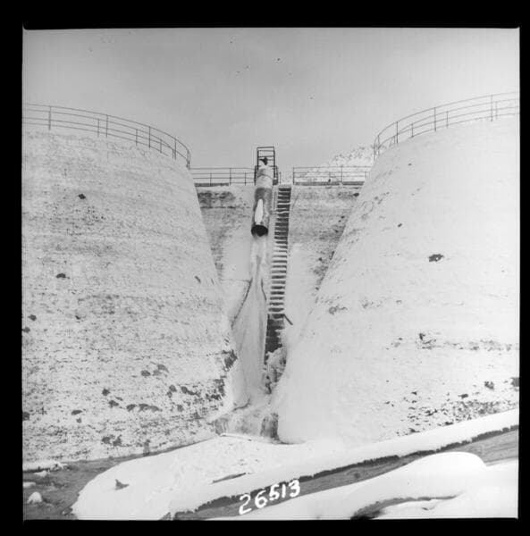Big Creek, Florence Lake Dam - Hooper - Slide 34" pipeline from top of dam.