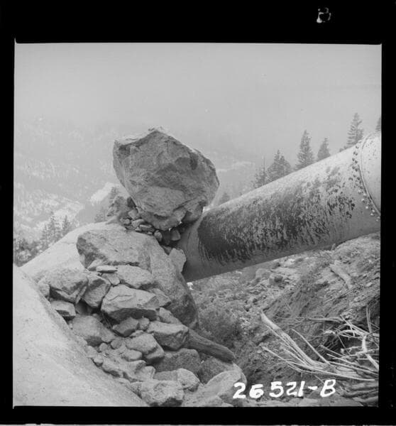 Big Creek #1 - Penstock Break P1L2 (4/6/46) - Boulders lodged against Line #3. [variant of 02-26521a].