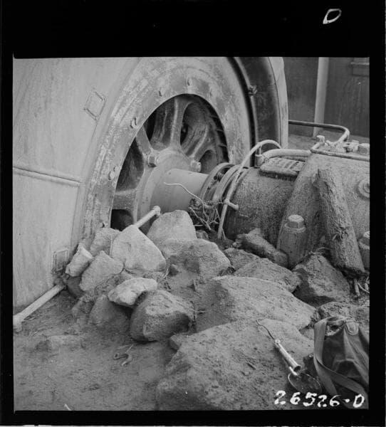Big Creek #1 - Penstock Break P1L2 (4/6/46) - boulders and debris around Unit #1. [variant of 02-26526a].
