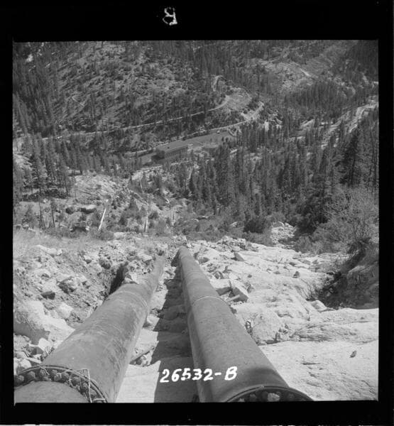 Big Creek #1 - Penstock Break P1L2 (4/6/46) - View down lines 1 & 2. [variant of 02-26531a].