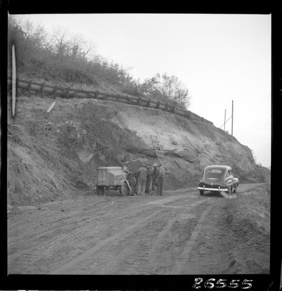 Kaweah #1 - Flume - View looking toward Oak Grove bridge from lumber pile between points K446 and K447, showing narrow rocky section of road in close proximity to flume. No road widening is contemplated in this section. Flume right-of-way is 10 feet wide in this section. SCE_596SCE_964.