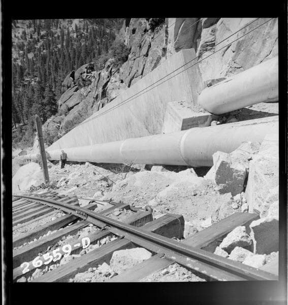 Big Creek Powerhouse #8 - Looking [down penstock] toward Mammoth Pool, cottage and switchyard site.