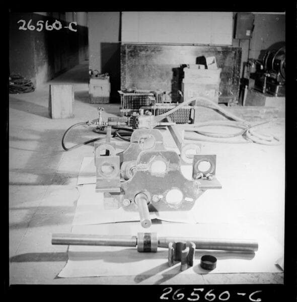 Big Creek Powerhouse #1 - Boring bar for machine bucket bolt holes, Unit #4. Line-up bar, split bushings & bearing.