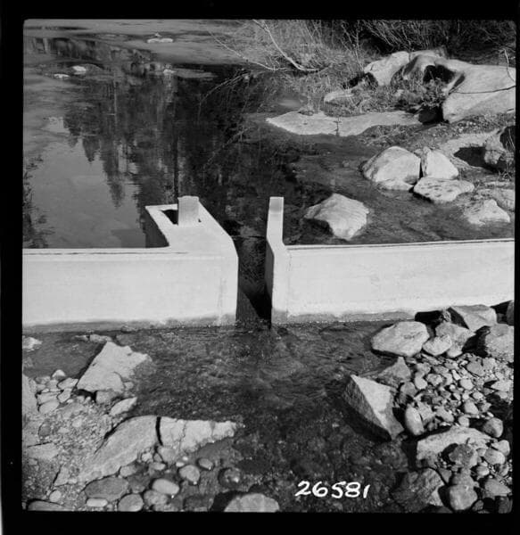 Big Creek, Huntington Lake Dams - Big Creek below Huntington Lake showing control with submerged Parshall Flume.