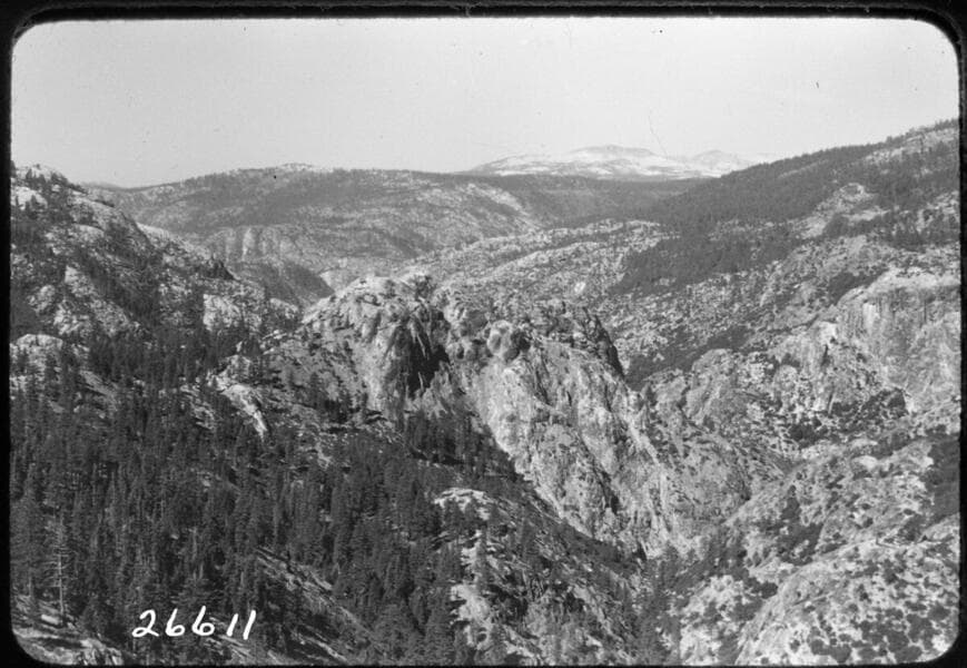 Big Creek Scenery - Reconnoissance of reservoir sites on middle fork San Joaquin River. Looking east on damsite on North Fork. [two added shots (5338 and 5339) on same Photocard]