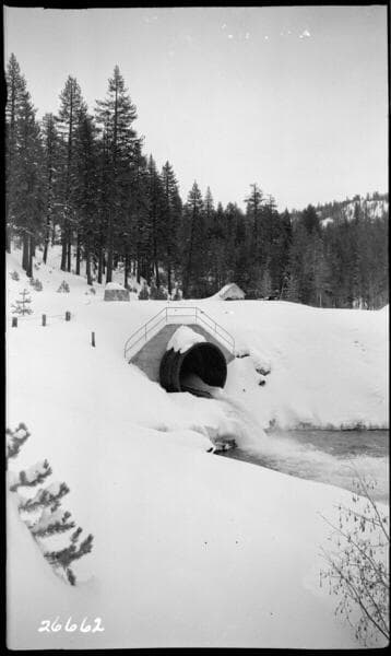 Big Creek, Florence Lake Dam - Outlet pipe from Florence Tunnel at Camp 60 overlooking end of 12ft. pipe from upstream.