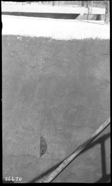 Big Creek, Florence Lake Dam - Close-up of gunite key at base of Arch #13, showing evidence of back leakage. Gunite key was covered with asbestile on November 25, 1942.