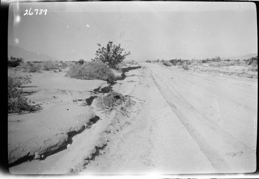 Boulder-Chino Transmission Line (3rd) - Storm damage near M42T2. Looking northerly along old road west of Mr. Dunn's property. Photo taken from Beacon tower.