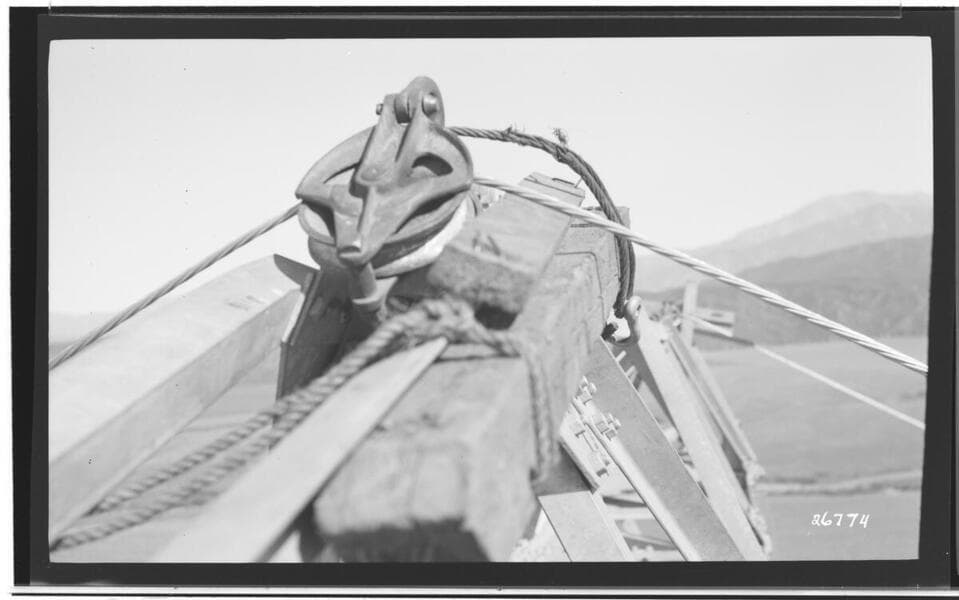 Boulder-Chino Transmission Line (3rd) - M62T4 - Transfering ground-wire from roller to clamp. Mt. San Jacinto in background.