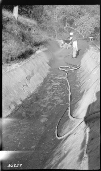 Kaweah #3 - Precast flume. Applying reinforced gunite coatings.