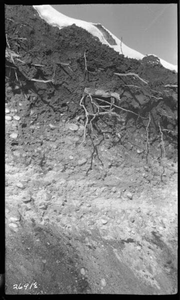 Big Creek, Huntington Lake Dams - Dam 1, Test pit - showing large boulders and cavities between contours below 6' layer of well compacted decomposed granite.