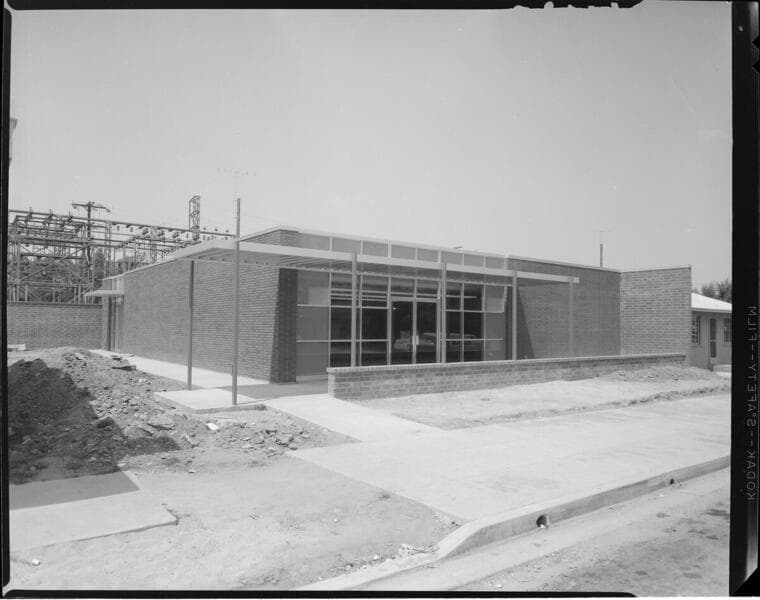 CEP General Office, Rialto - with construction site sign declaring construction of the new Calif. Electric Power Company's, General Headquarters building