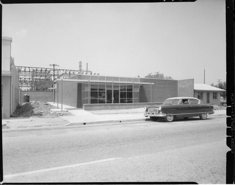 CEP General Office, Rialto - with construction site sign declaring construction of the new Calif. Electric Power Company's, General Headquarters building