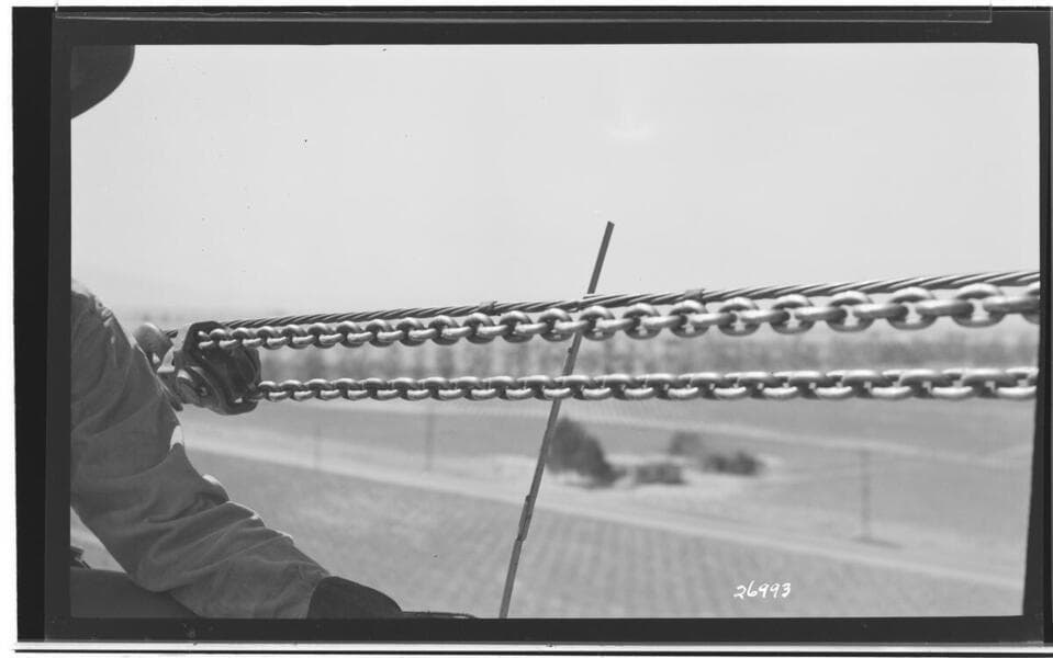 Boulder-Chino Transmission Line (2nd) - (1940 construction) Repairing vibration breaks in groundwire.