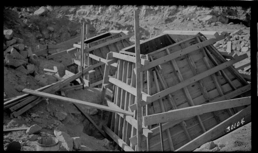 Big Creek Powerhouse #4 - Forms & concrete for powerhouse foundation, looking up penstock.