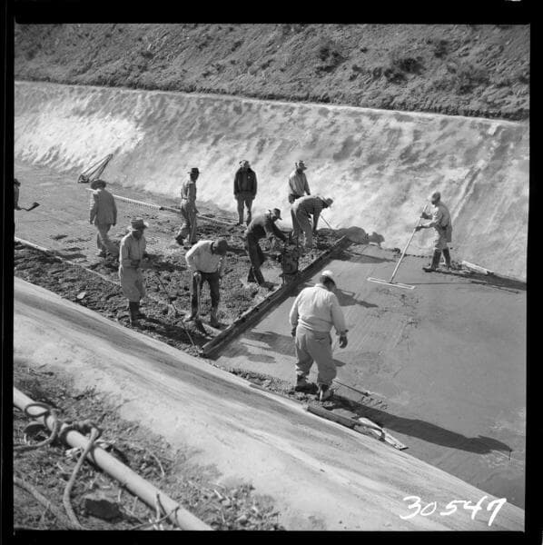 Borel Powerhouse - Borel - Placing concrete floor slab in cut-over canal