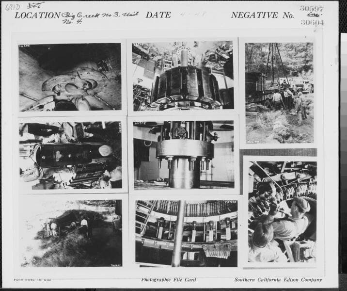 Big Creek Powerhouse #3 - Unit #4 - Lowering rotor into generator during assembly of generator.