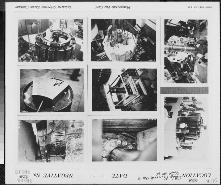 Big Creek Powerhouse #3 - Unit #4 - Lowering rotor into generator during assembly of generator.