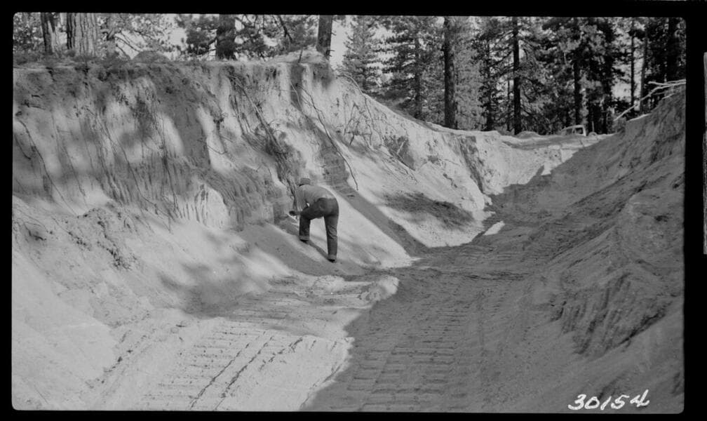Big Creek, Vermilion Dam - Moraine cut near D-105 - bulldozer pushing boulders from depth 12' - L[ooking] west.