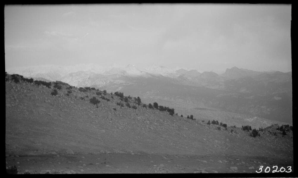 Big Creek, Vermilion Dam - Glaciation studies - Valley southeast slope of Saddle Mt. showing "moraine" or talus deposit of mixed lava and granite.