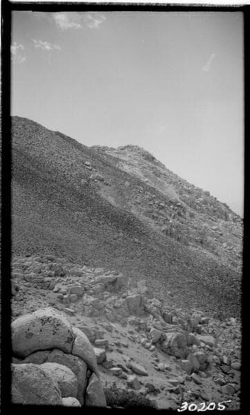 Big Creek, Vermilion Dam - Glaciation studies - Valley southeast slope of Saddle Mt. showing "moraine" or talus deposit of mixed lava and granite.