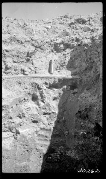 Big Creek, Huntington Lake Dams - Dam 1, Test pit - showing large boulder buried compacted soil.