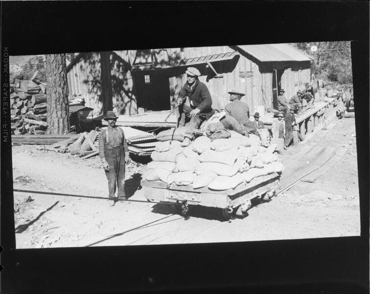 Tramway hauling bags of cement up to Agnew Lake and Gem Lake dam construction sites