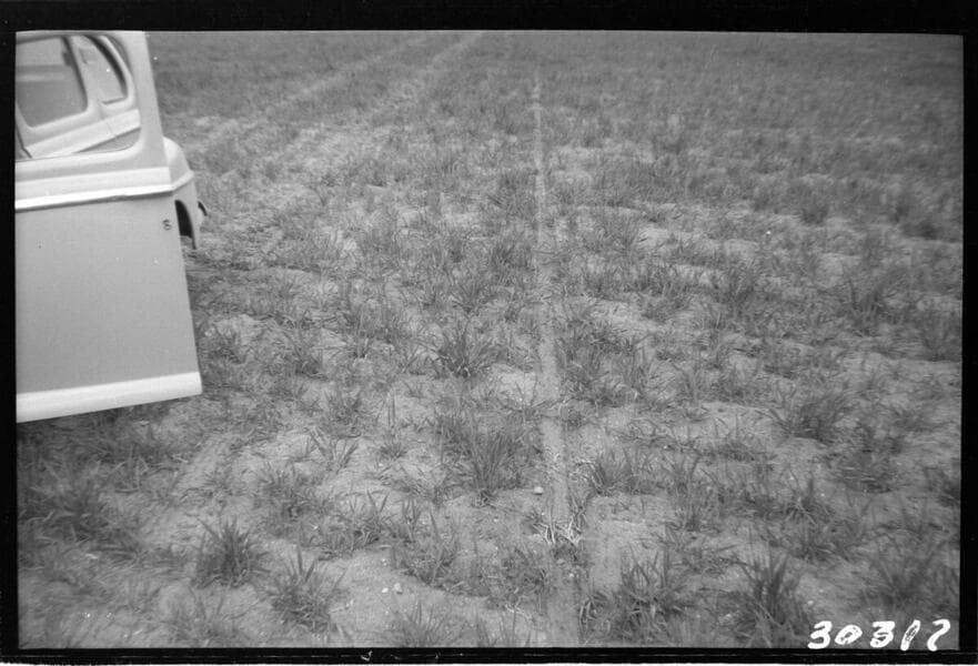 Vincent Transmission Line (2nd) - South side [Tower] 13-3 - showing effects of line stringing and guard pole placement in barley field.