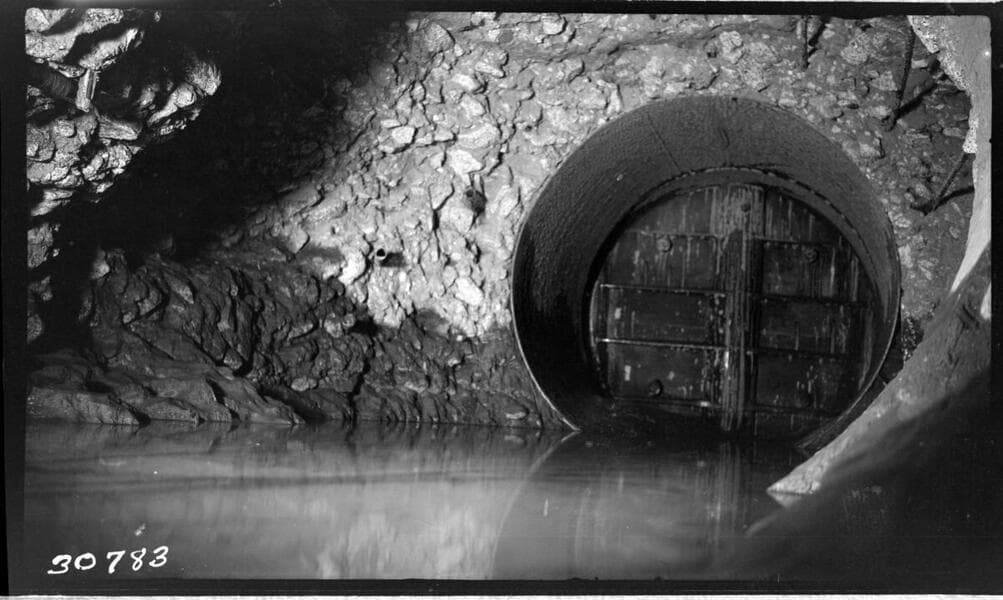 Big Creek Powerhouse #4 - Dam 7 showing fish water turbine draft tube and temporary sluice pipe.