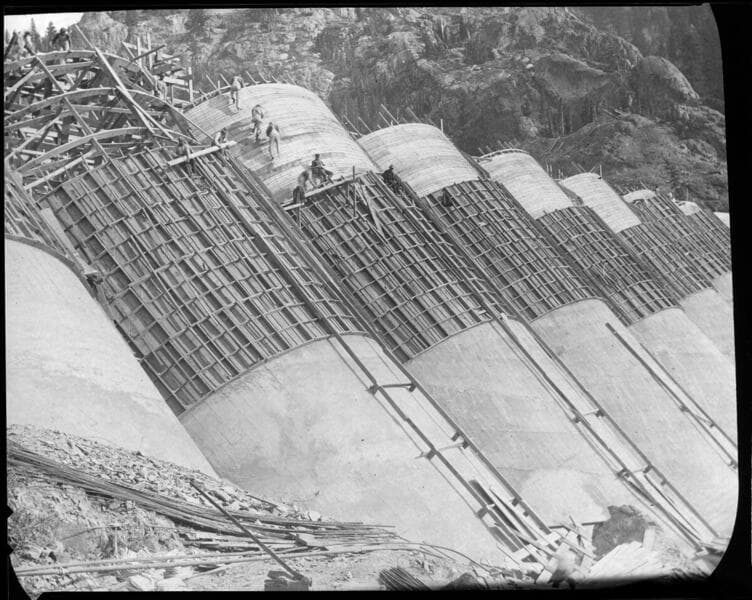 Big Creek, Florence Lake Dam - Construction of multiple-arch dam, looking down on buttresses and arch rings.