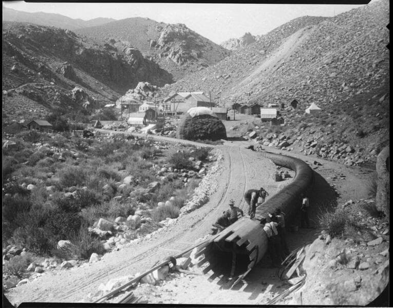 Crew constructing the redwood-stave flowline for Bishop Creek Powerhouse #4 (1904-1905) - Nevada Mining, Milling and Power Co