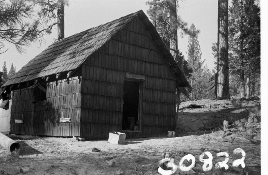 Big Creek, West Side Project - Jackass cabin looking upstream toward gauging station in background.