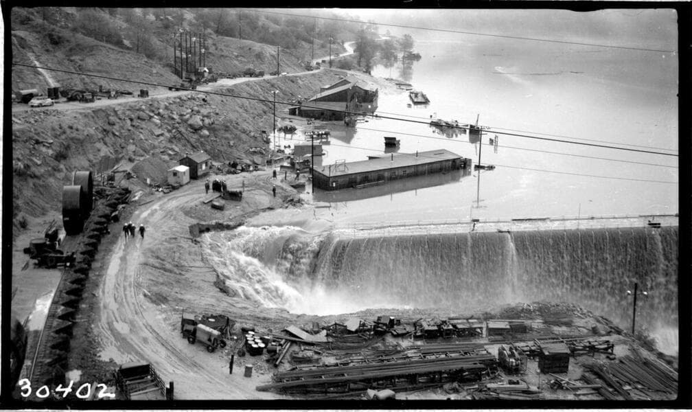 Big Creek Powerhouse #4 - Dam 7 during flood [showing wash-out at north abutment].