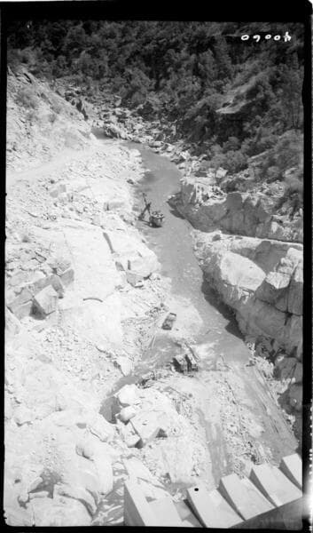 Big Creek Powerhouse #4 - Dam 7 showing fish water turbine draft tube and temporary sluice pipe.