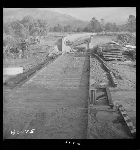 Borel Powerhouse - Kern River - Borel 3rd stage - Shows work accomplished on construction of new concrete flume at Tilley #3 prior to canal outage when steel flume can be removed. Concrete piers raised and backfilled for floor slab support with the exception of two center spans which were left open for drainage.
