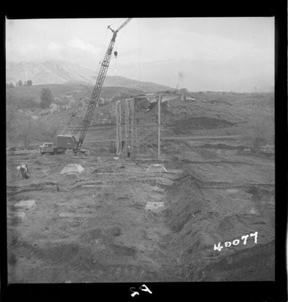 Borel Powerhouse - Kern River - Borel 3rd stage - Shows work accomplished on construction of new concrete flume at Tilley #3 prior to canal outage when steel flume can be removed. Concrete piers raised and backfilled for floor slab support with the exception of two center spans which were left open for drainage.