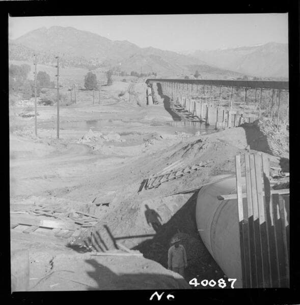 Borel Powerhouse - Borel 3rd Stage - Progress picture along siphon north of Kern River Crossing. Hoist used for closing pipe sections mounted in foreground.