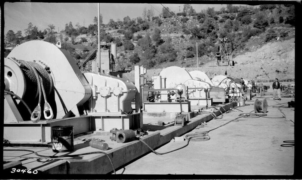 Big Creek Powerhouse #4 - Gate winches on crest of Dam #7 during construction construction.