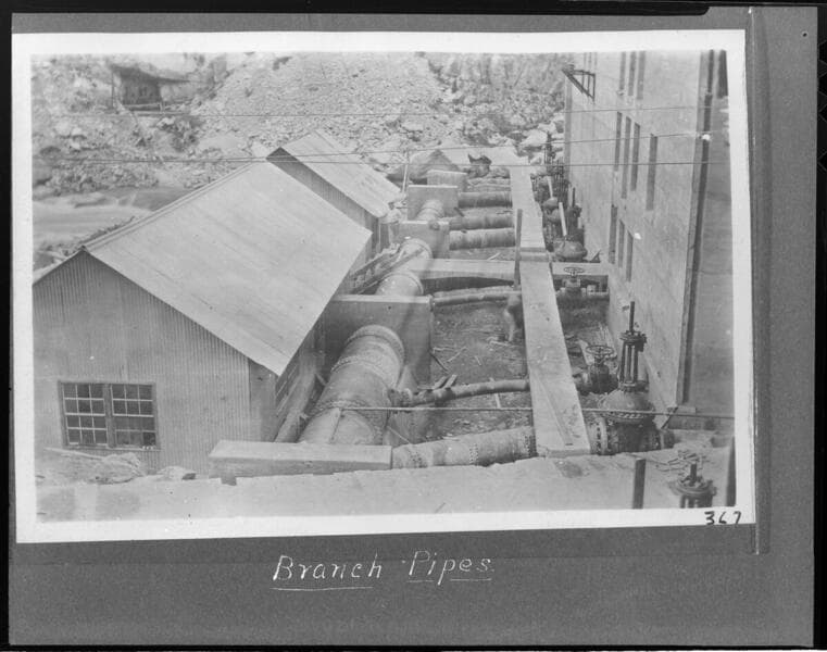 Kern River No. 1, including site for Democrat Dam; Dam construction and drainage tower; intake; dam spilling; Construction at Camp 4; Kern River Canyon, hospital, tunnel workers, tunnel portal, concrete mixing plant, concrete flume, tunnel automobiles; Camp 1, penstock construction, branch pipes, Powerhouse construction, machinery transport to site, assembly of units in powerhouse, placing "Y" piece, main water valve needle, exciter needle, impulse wheel and buckets, transformers, tailrace construction, original spillway, towers and erect insulators, transmission line; Tejon, Castaic and Fernando Substations, Los Angeles No. 3 Steam Plant.