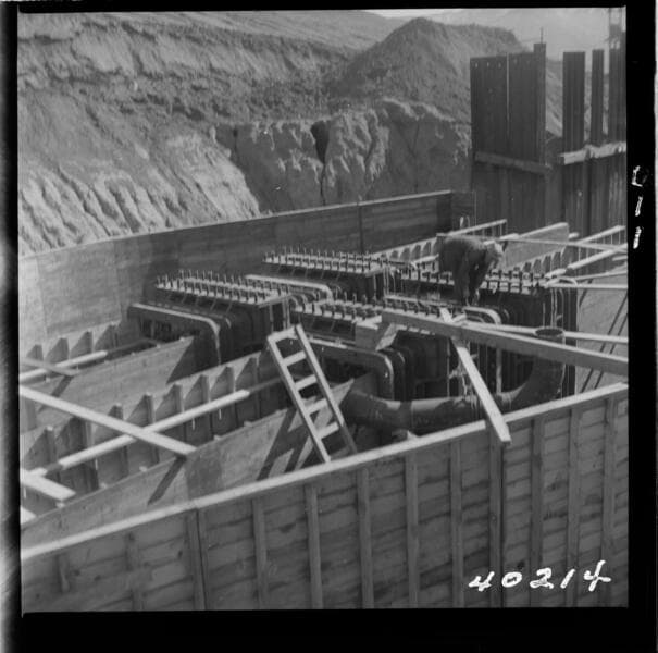 Borel Powerhouse - Isabella Aux. Dam showing installation of gates and construction of conduits through dam.