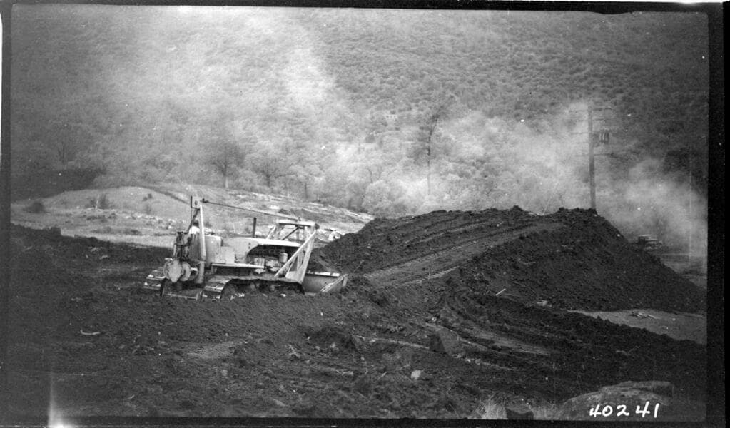 Big Creek Powerhouse #3 - Progress picture showing completed grading for house sites 7 to 12 inclusive. Cat in background spreading topsoil.