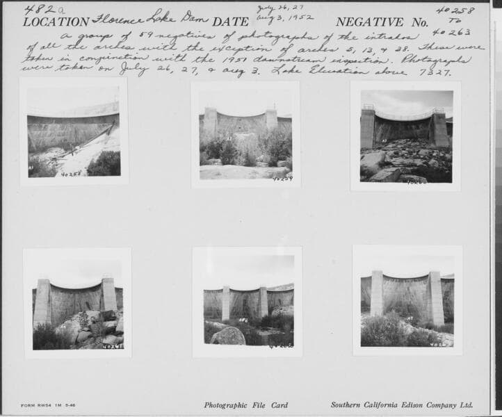 Big Creek, Florence Lake Dam - Photograph showing Intrados of Arch #1. Taken in conjunction with 1951 inspection - lake elevation was above 7327'.