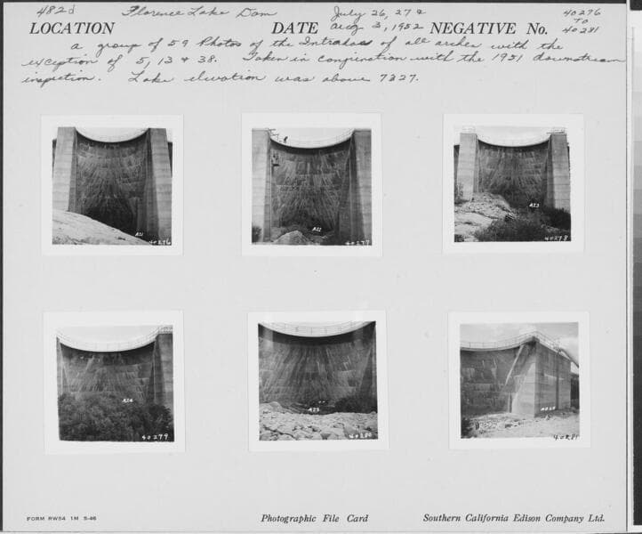 Big Creek, Florence Lake Dam - Photograph showing Intrados of Arch #1. Taken in conjunction with 1951 inspection - lake elevation was above 7327'.