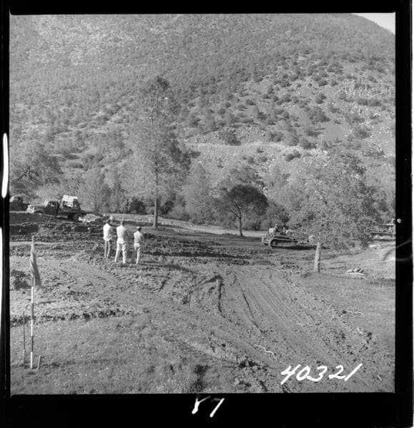 Big Creek Powerhouse #3 - Progress picture showing excavating for house sites 20 - 24 and placing road fill in front of these houses. View taken from top soil stack pile between house sites 16 & 14.