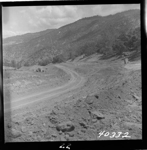 Big Creek Powerhouse #3 - Progress picture looking east from house 16, showing excavated bench for houses 17 to 24 inclusive. [Sewer and water line trench excavated in road in front of these houses.]