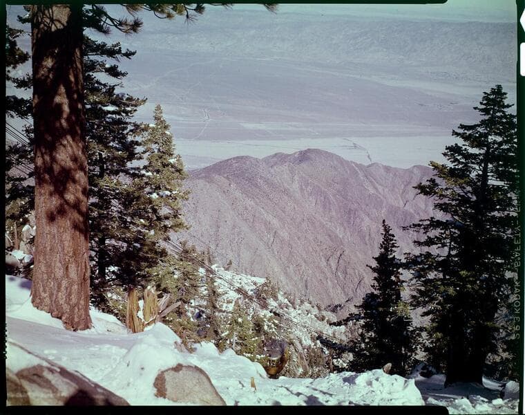 Palm Springs Aerial Tramway - view from ground to Coachella Valley with gondola coming up. (color trans.)