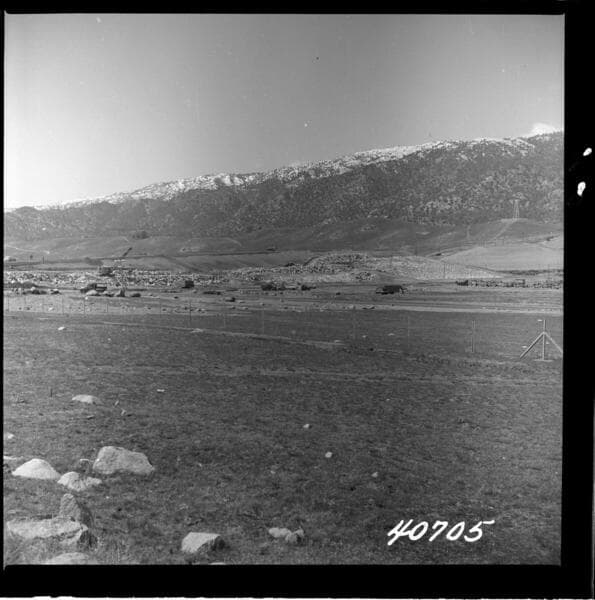 Borel Powerhouse - Isabella Auxiliary Dam showing compacted fill in center section of dam. Portal tower for Borel Conduit Gates being constructed simultaneously with placement of fill.