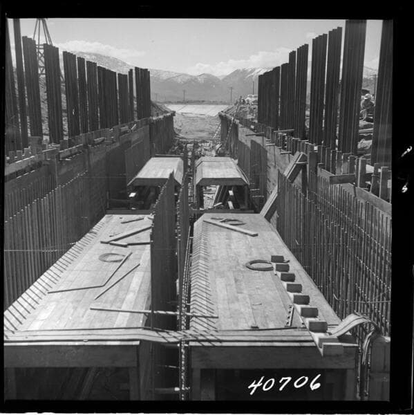 Borel Powerhouse - Isabella Aux. Dam showing installation of gates and construction of conduits through dam.