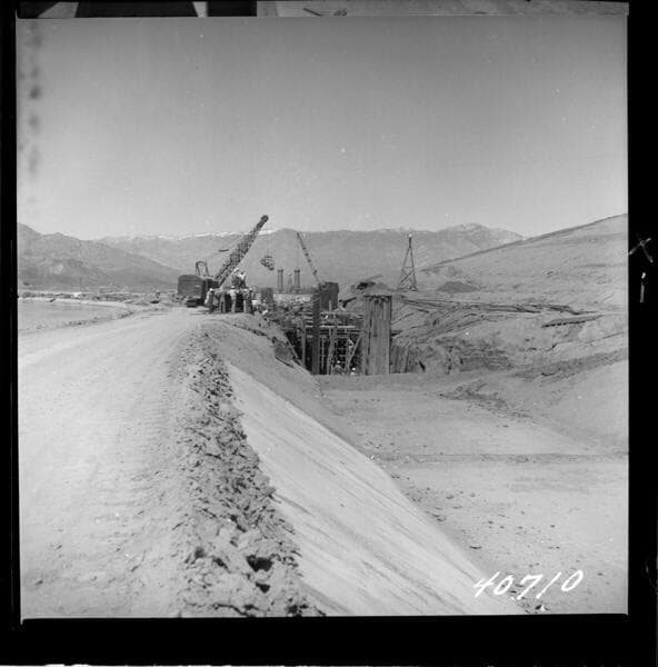 Borel Powerhouse - Isabella Aux. Dam showing installation of gates and construction of conduits through dam.