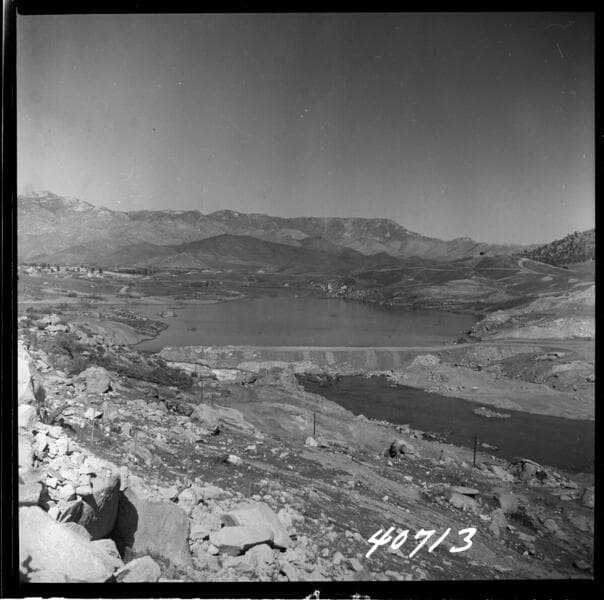 Borel Powerhouse - Isabella Main Dam - view of site preparation for main dam, taken from main Hwy on centerline of canal trench. Excess run-off in Kern River over construction cofferdam seen in river channel.